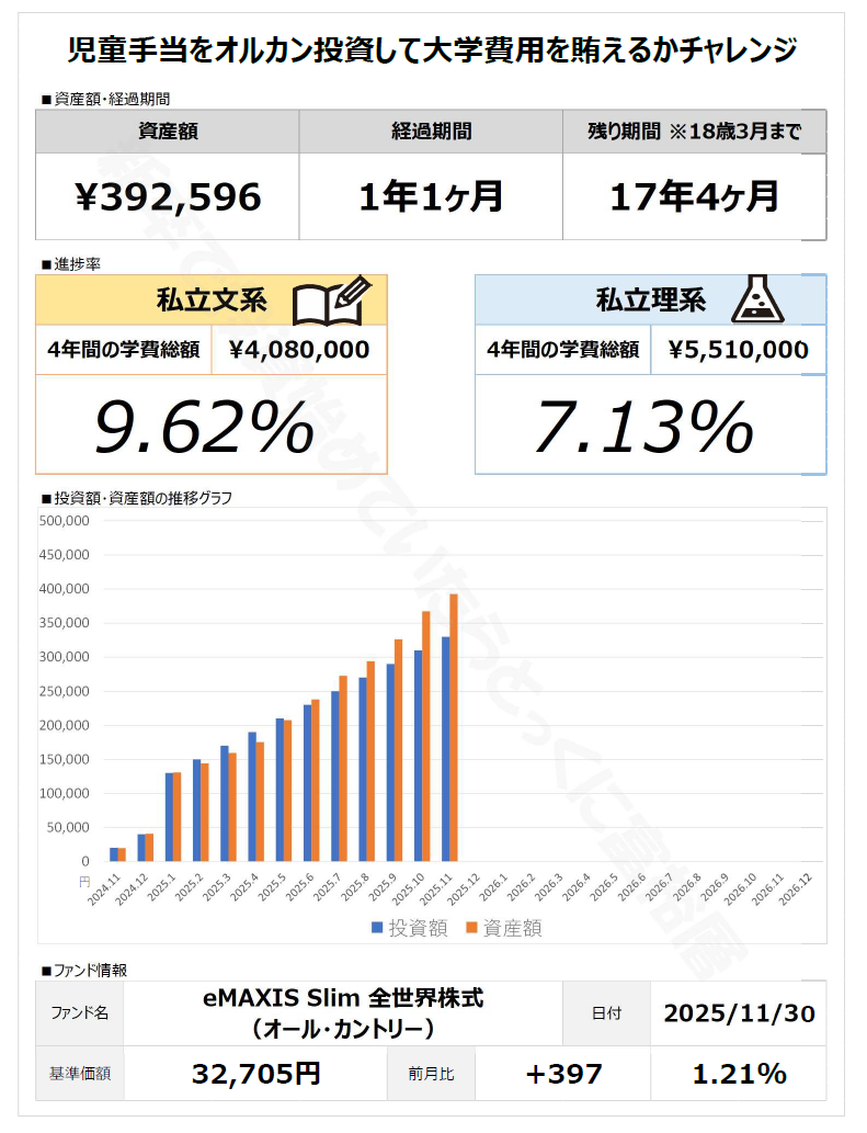 以前アップした「児童手当をオルカン投資して大学費用を賄えるかチャレンジ」について、実際に運用を開始しましたので成績をまとめました。