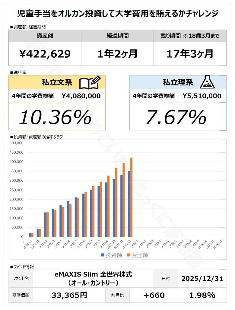【2025年12月】児童手当をオルカン投資して大学費用を賄えるかチャレンジ