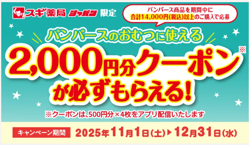 - 条件:①スギ薬局グループ店舗で②パンパース商品を合計14,000円(税込)以上購入